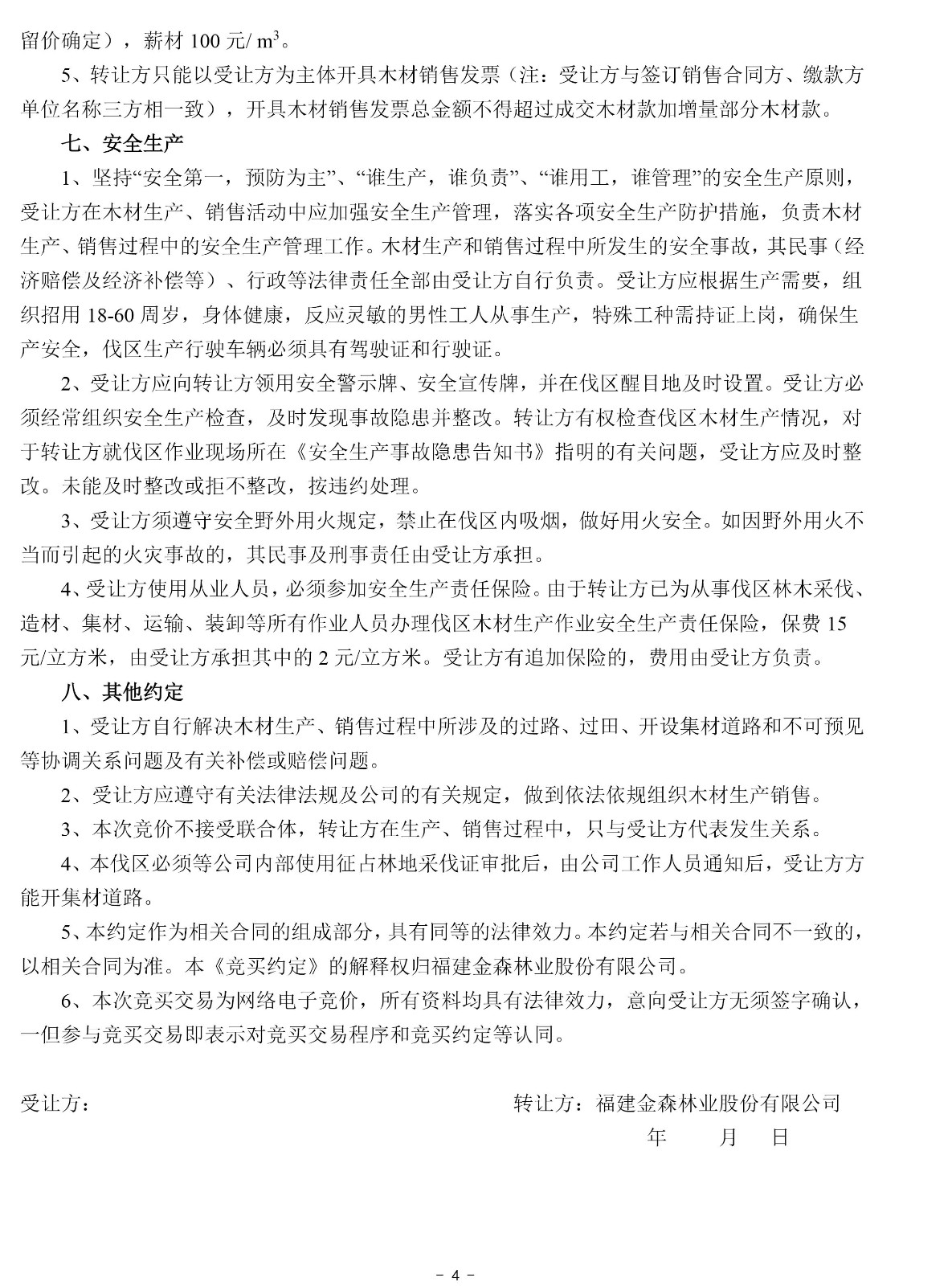 成交確認、價款支付及合同簽訂 | 1 .成交后的兩個工作日內受讓方以微信、郵箱等方式收到《成交通知書》掃描件或電話通知;若受讓方未及時收到成交通知書的,請主動與轉讓方聯系。 2.價款交納日期及方式:成交后,受讓方須于2022年2月16日17:00前將首期木材款(詳見木材資源情況一覽表)及每標生產風險保證金6.5萬元(含木材生產進度、質量保證金3萬元;銷售進度保證金1.5萬元;安全生產保證金2萬元)轉入轉讓方指定銀行賬戶,并與轉讓方簽訂《木材生產承攬合同》和《木材購銷合同》。尾款交付方式以木材資源情況一覽表為準。 轉讓方指定銀行賬戶如下: 戶名:福建金森林業股份有限公司 開戶銀行:福建將樂成功村鎮銀行股份有限公司 賬號:9031510010010000033058 3.受讓方不依據本公告的要求履約的,視為自動放棄受讓資格,其已交納的交易保證金不予退回,并對交易中心因此造成的損失承擔賠償責任,轉讓方有權將該標的重新組織競買交易。 | ||
